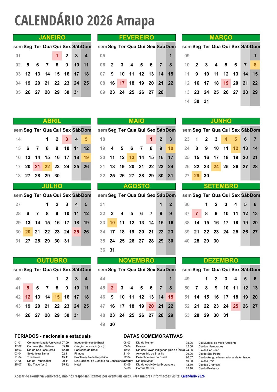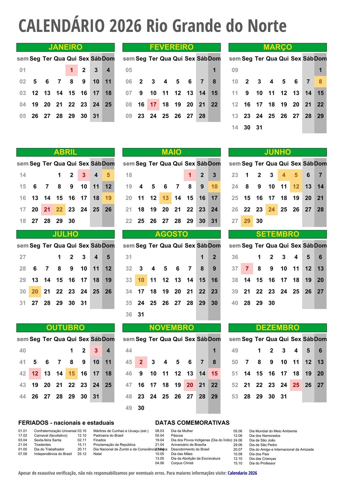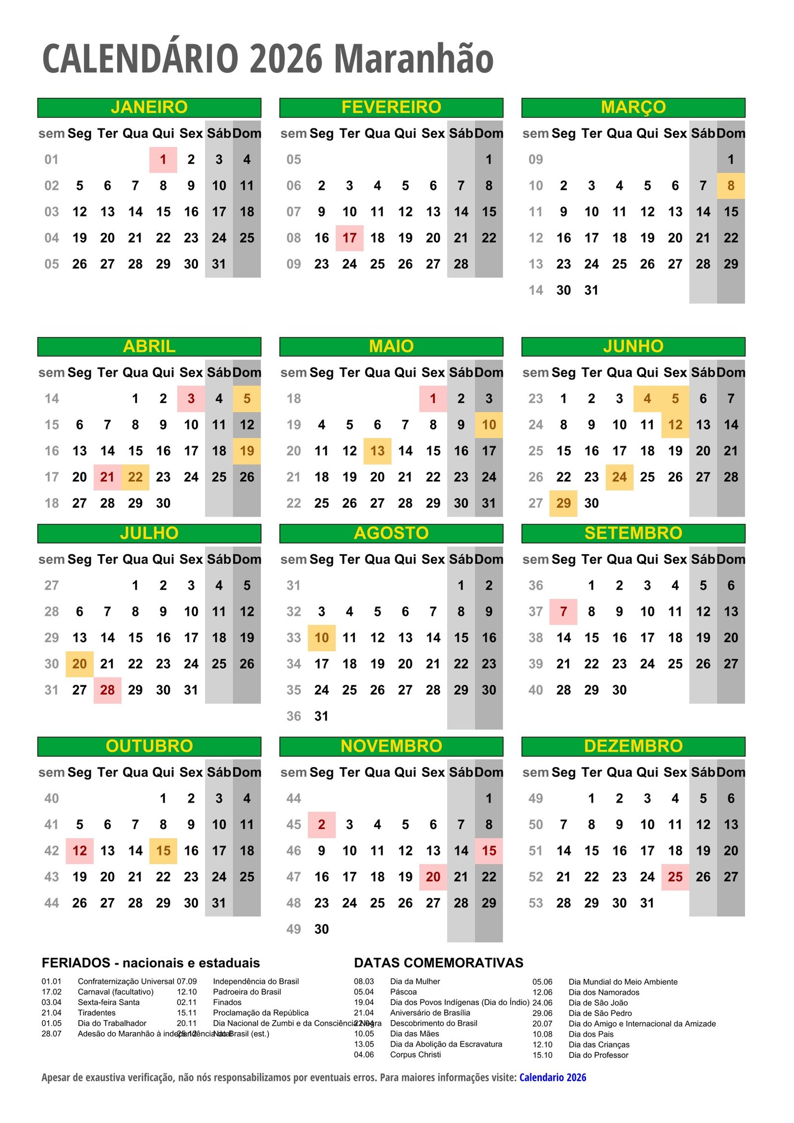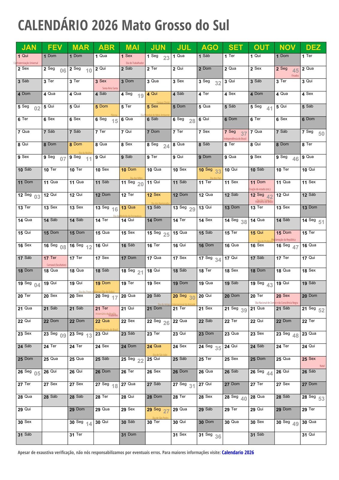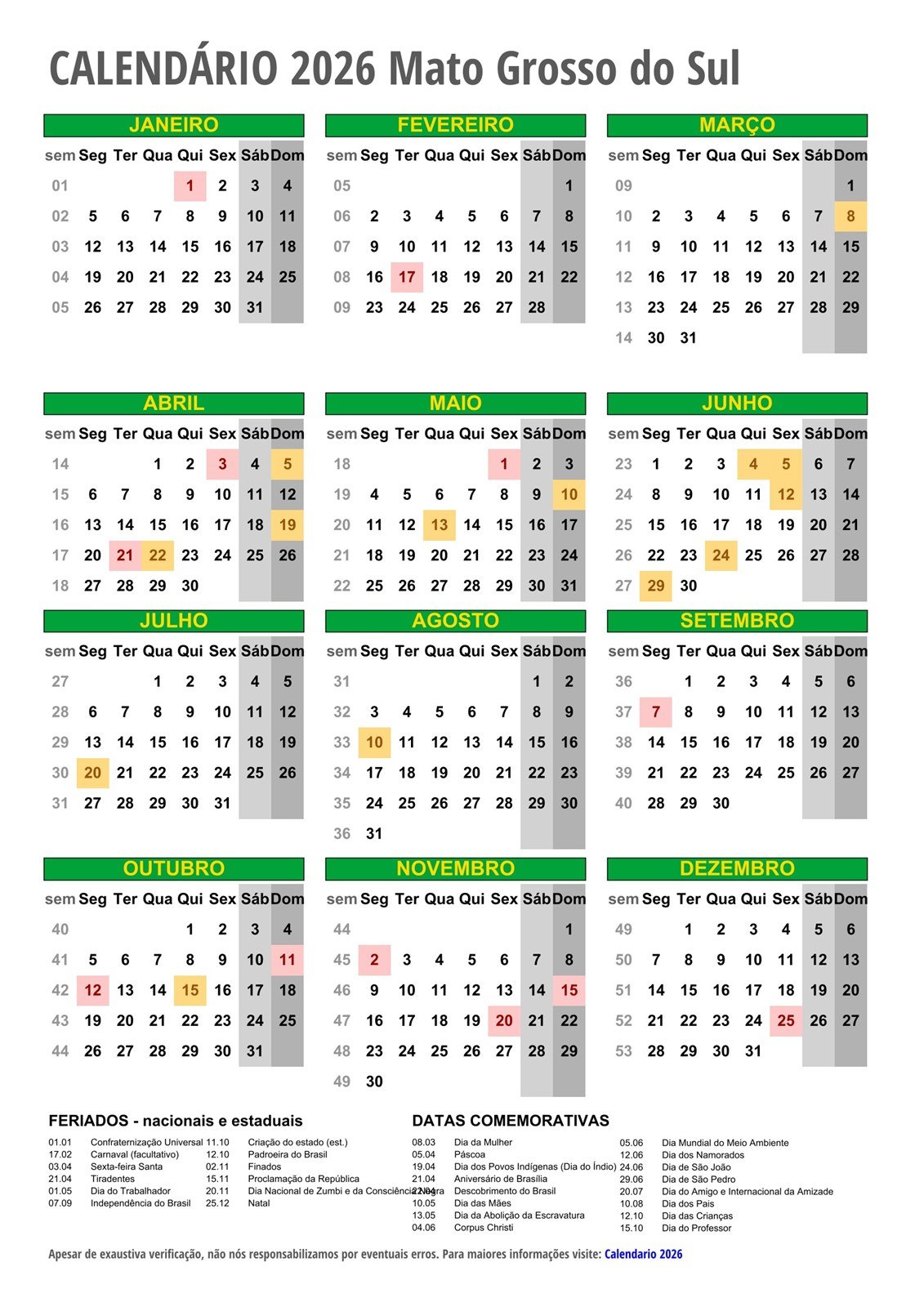 Calendário 2026 Mato Grosso do Sul para imprimir