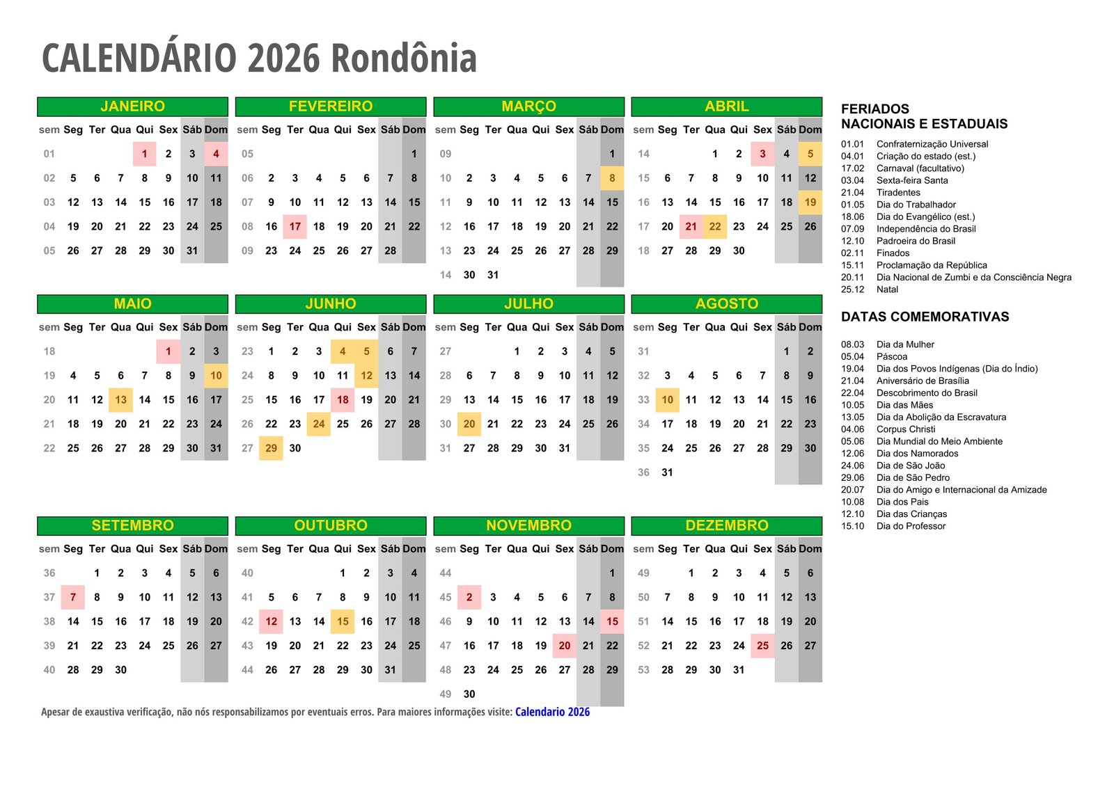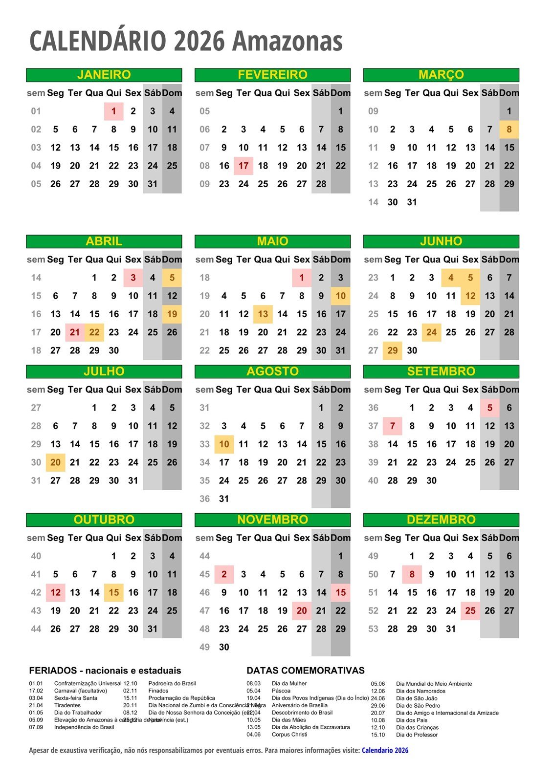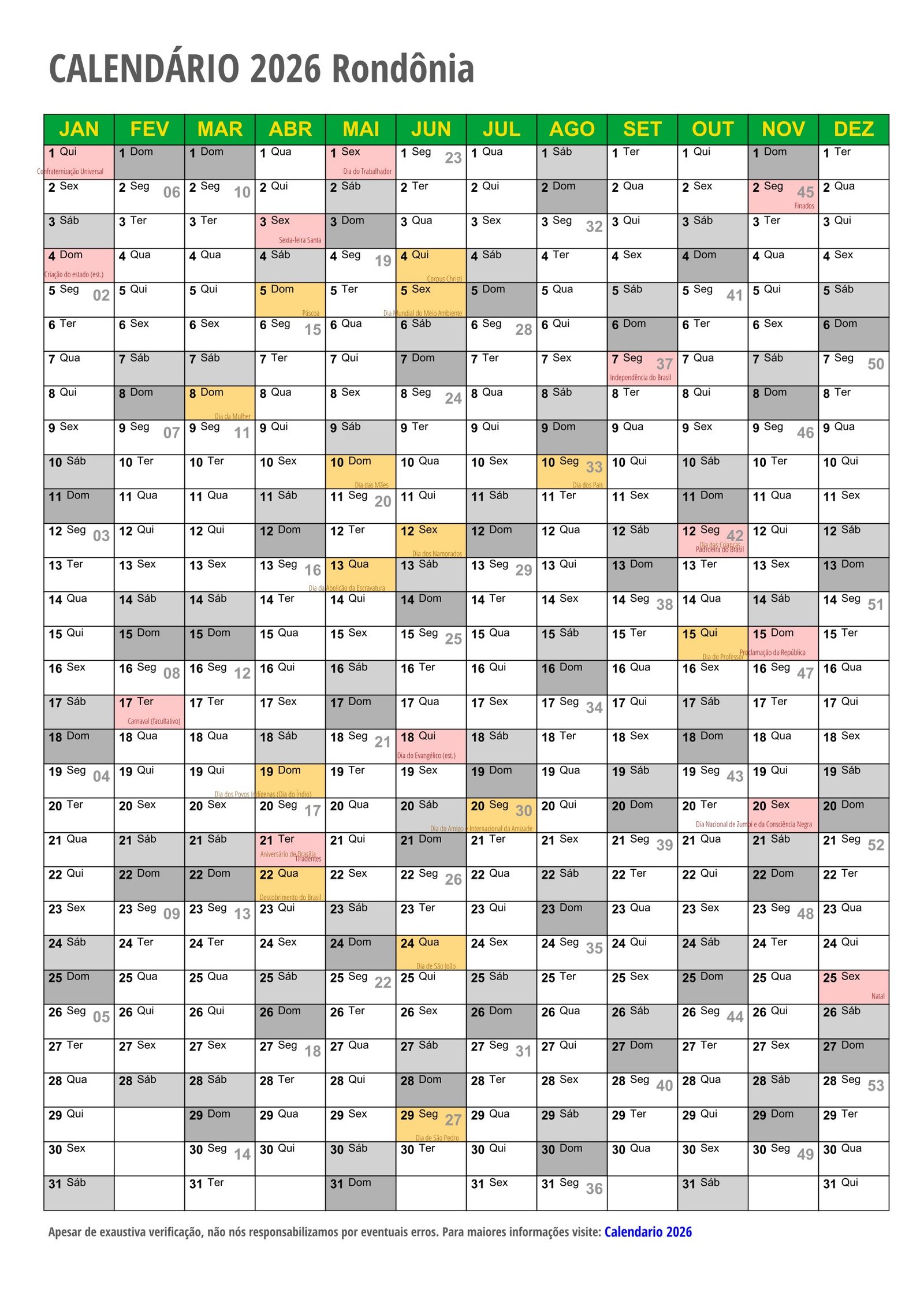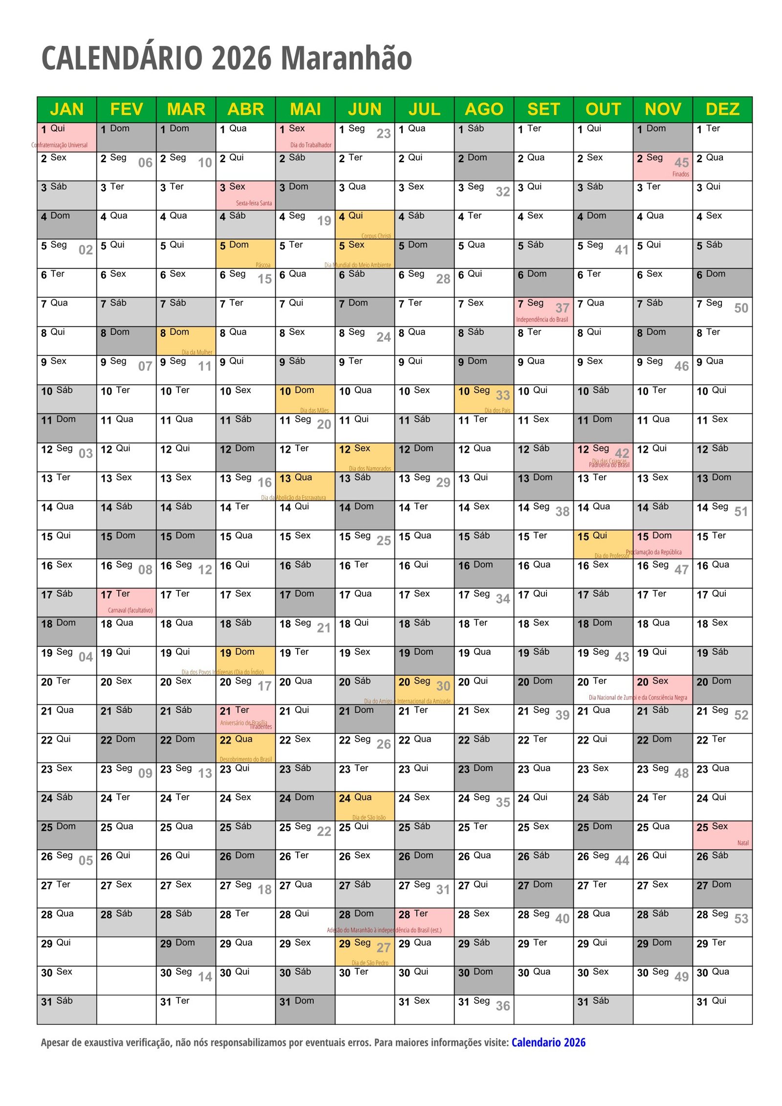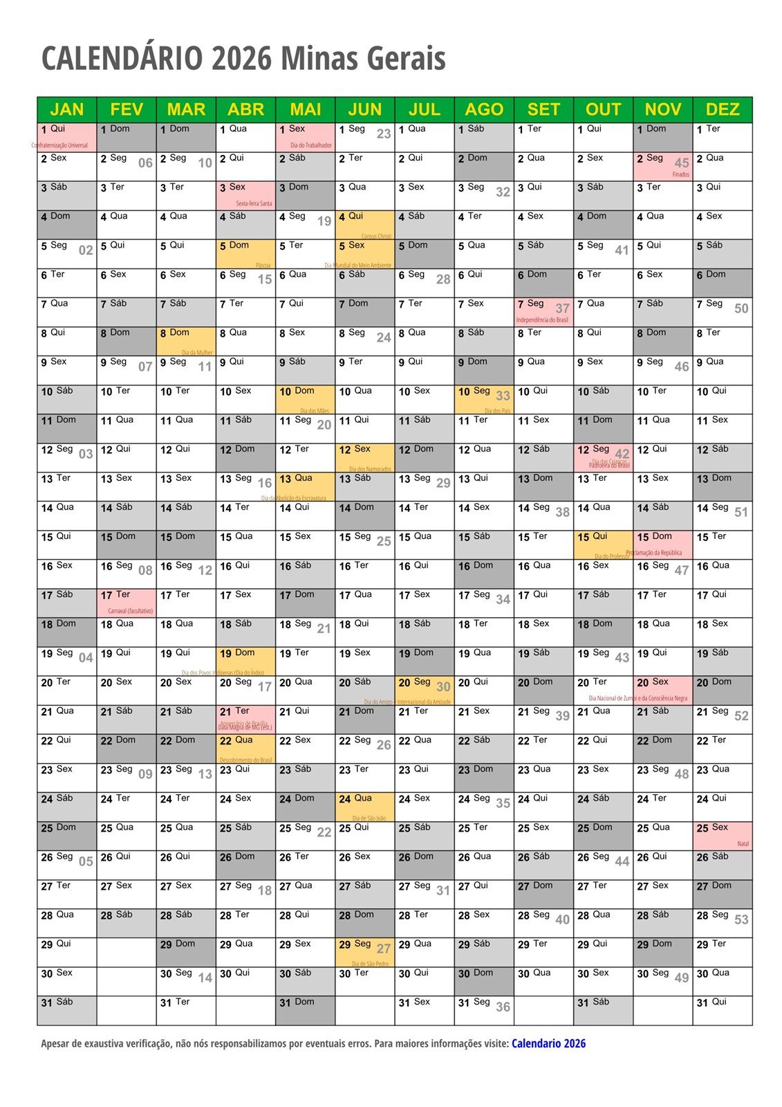Calendário 2026 Mato Grosso do Sul para imprimir