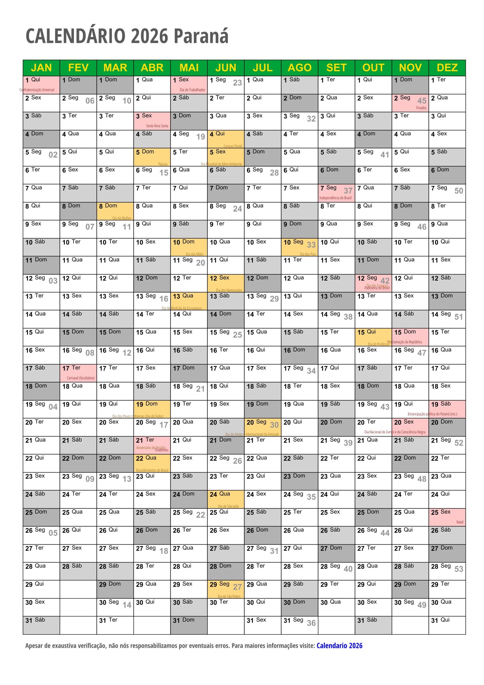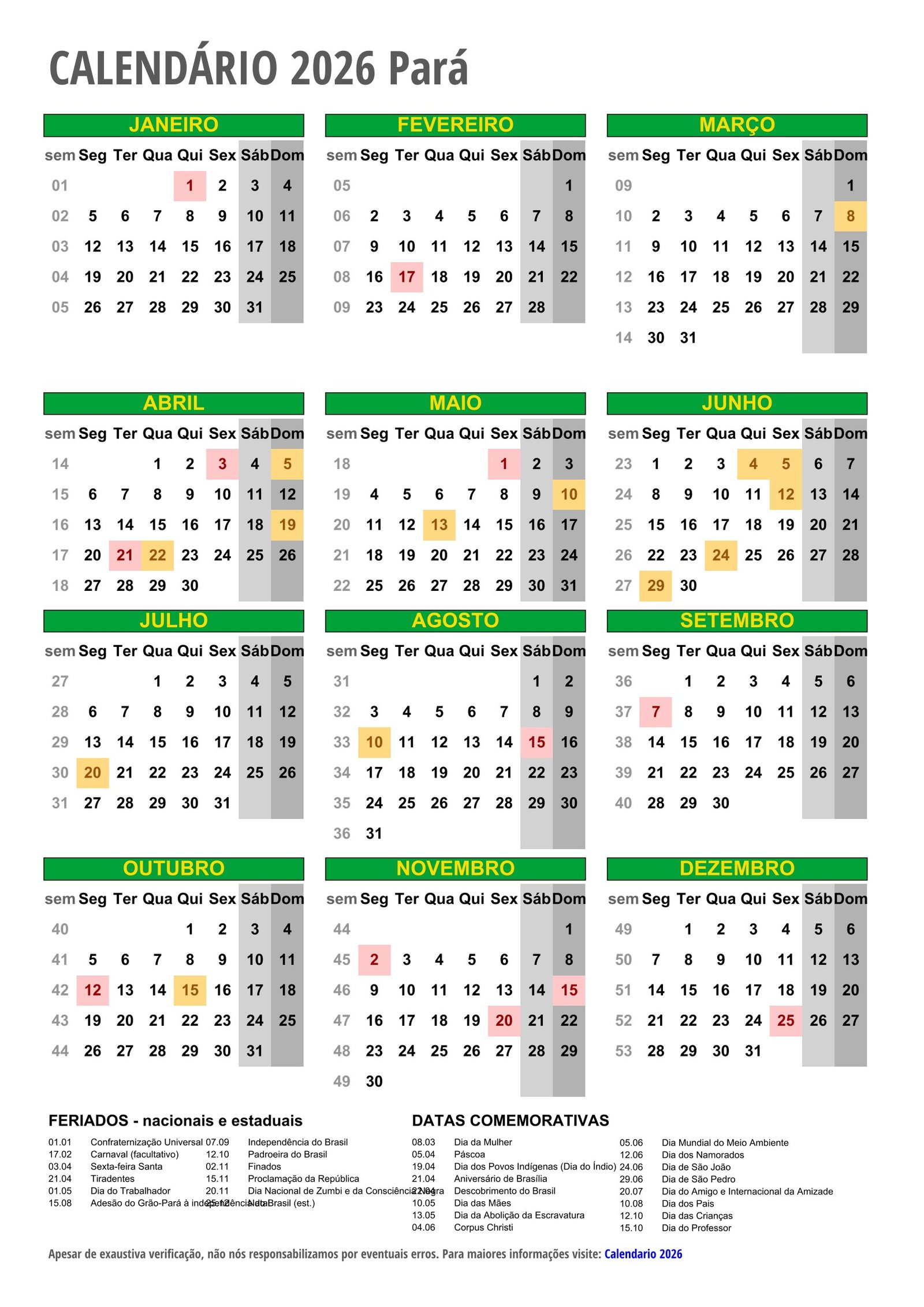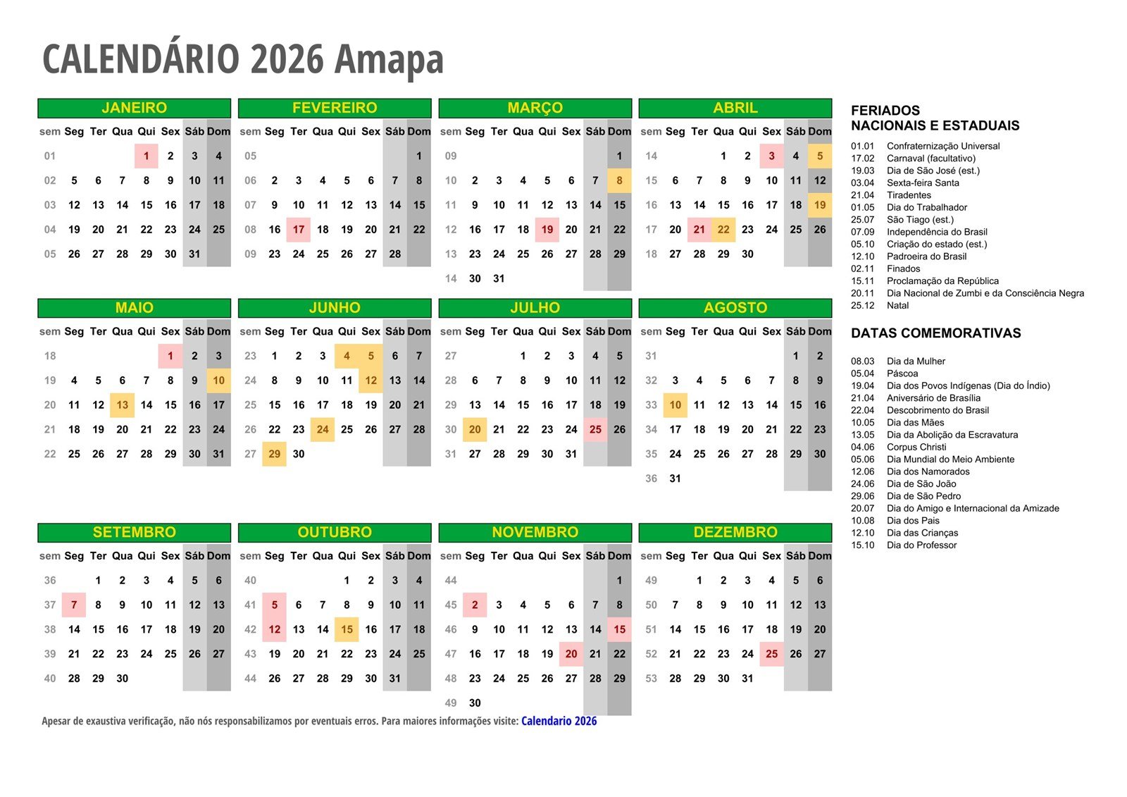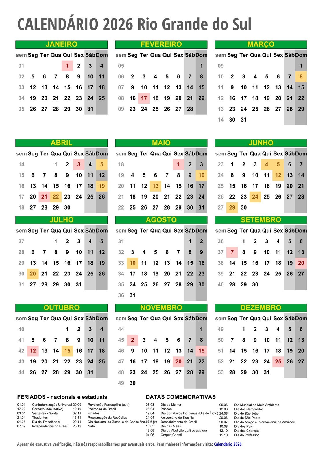 Calendário 2026 Mato Grosso do Sul para imprimir