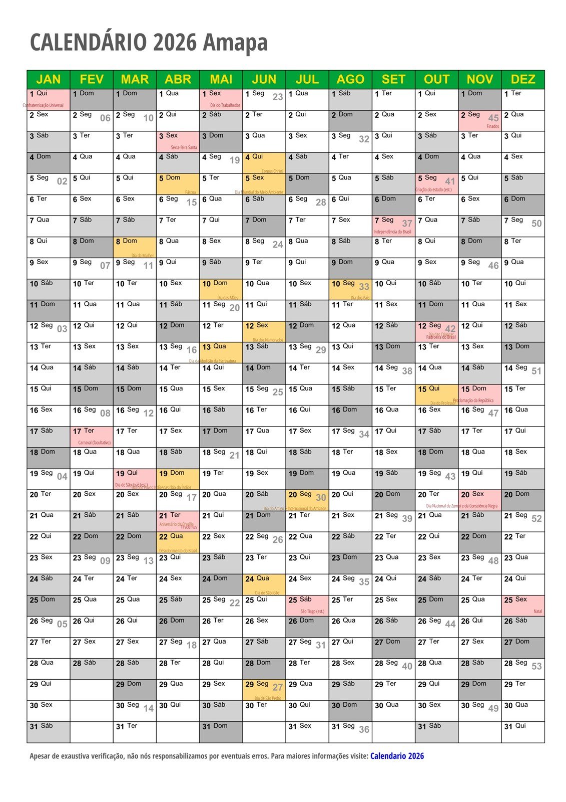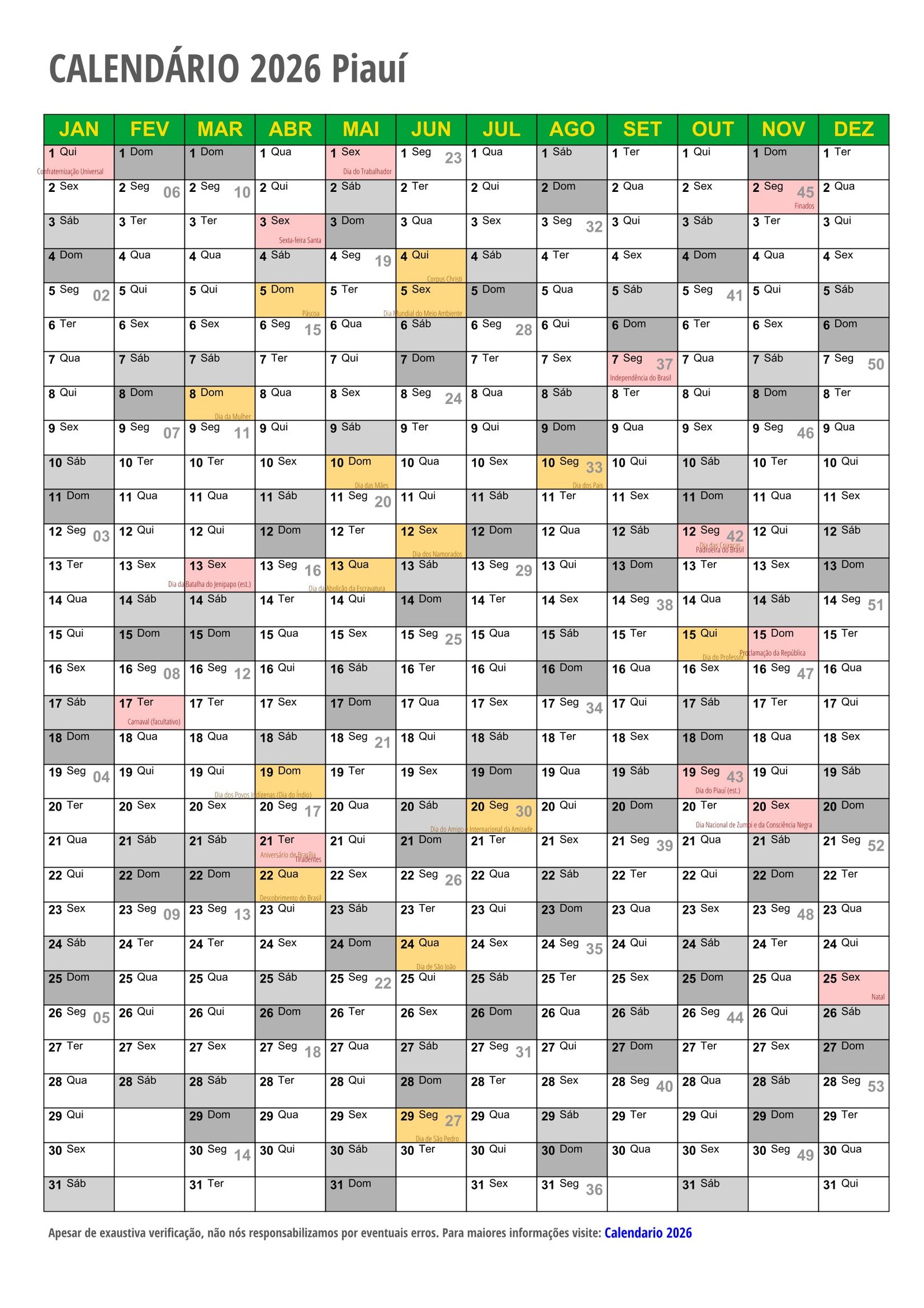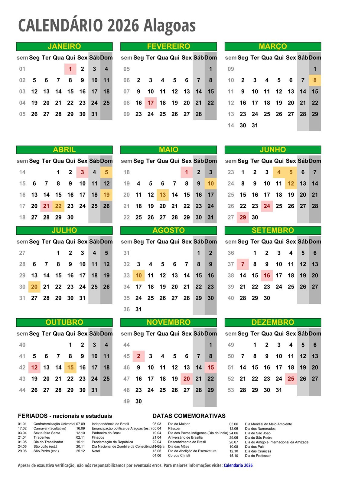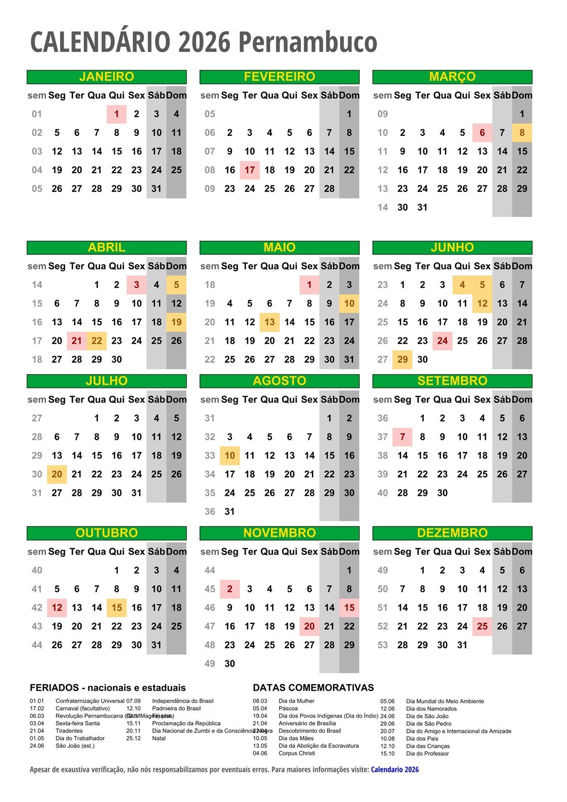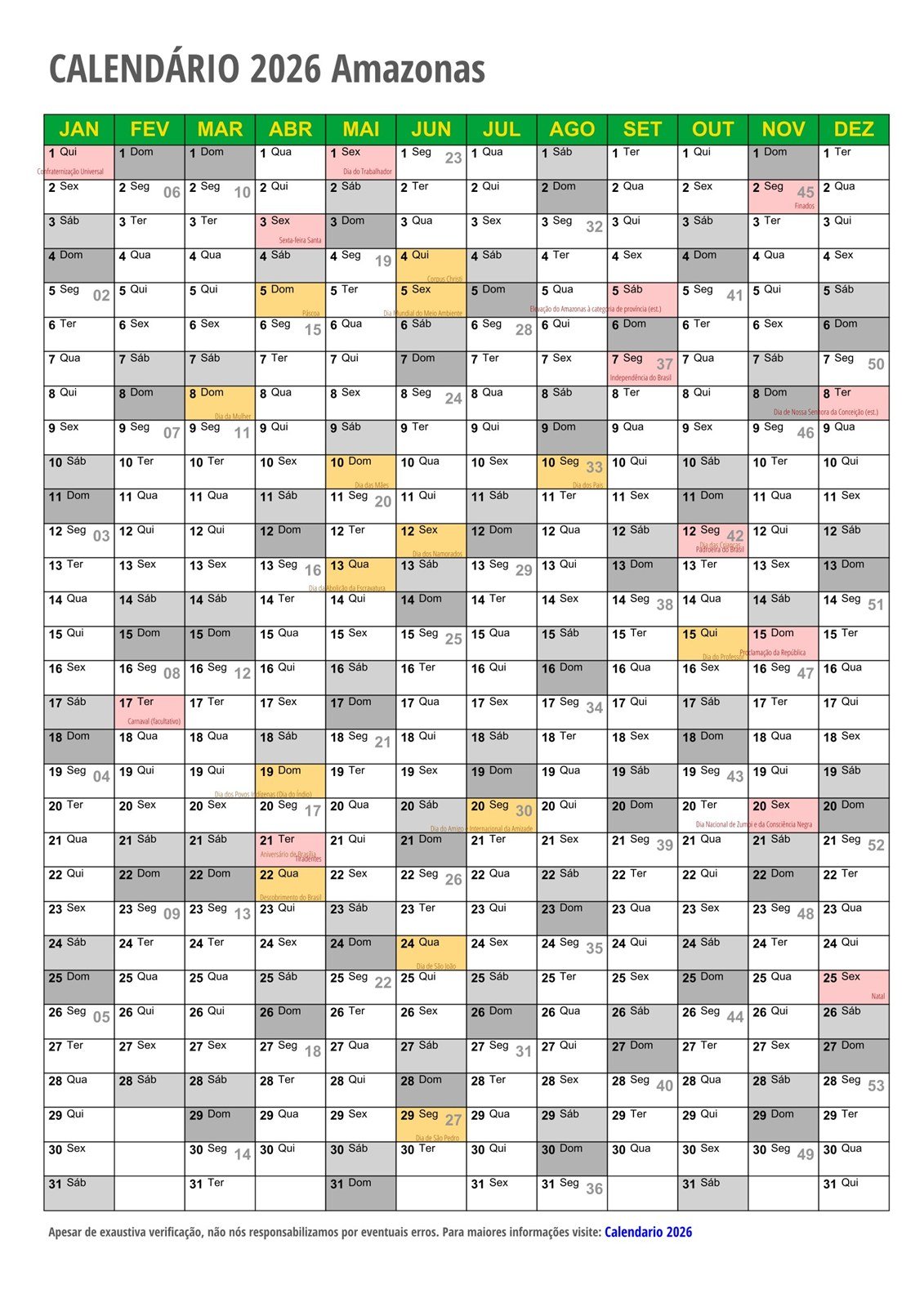 Calendário 2026 Mato Grosso do Sul para imprimir