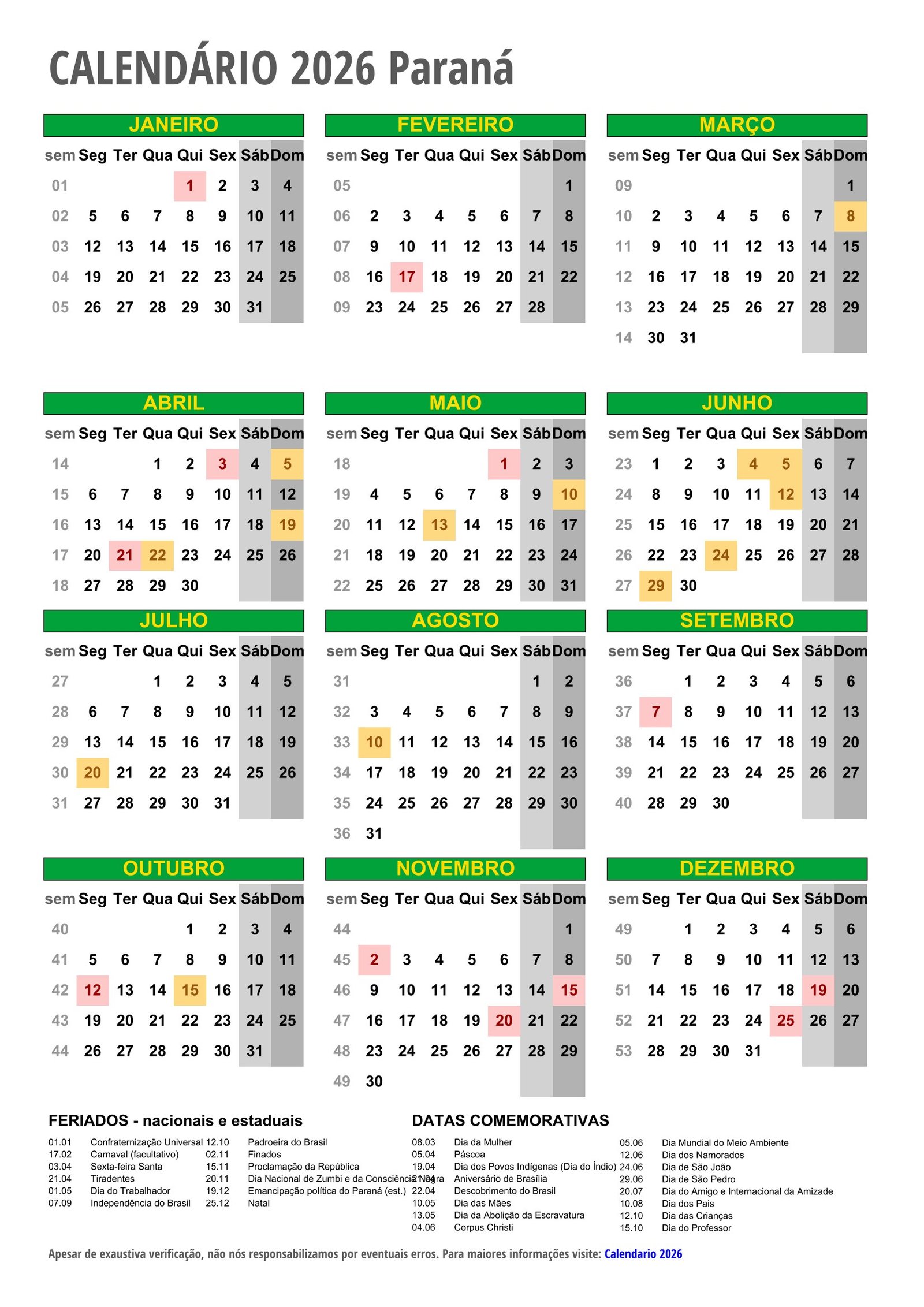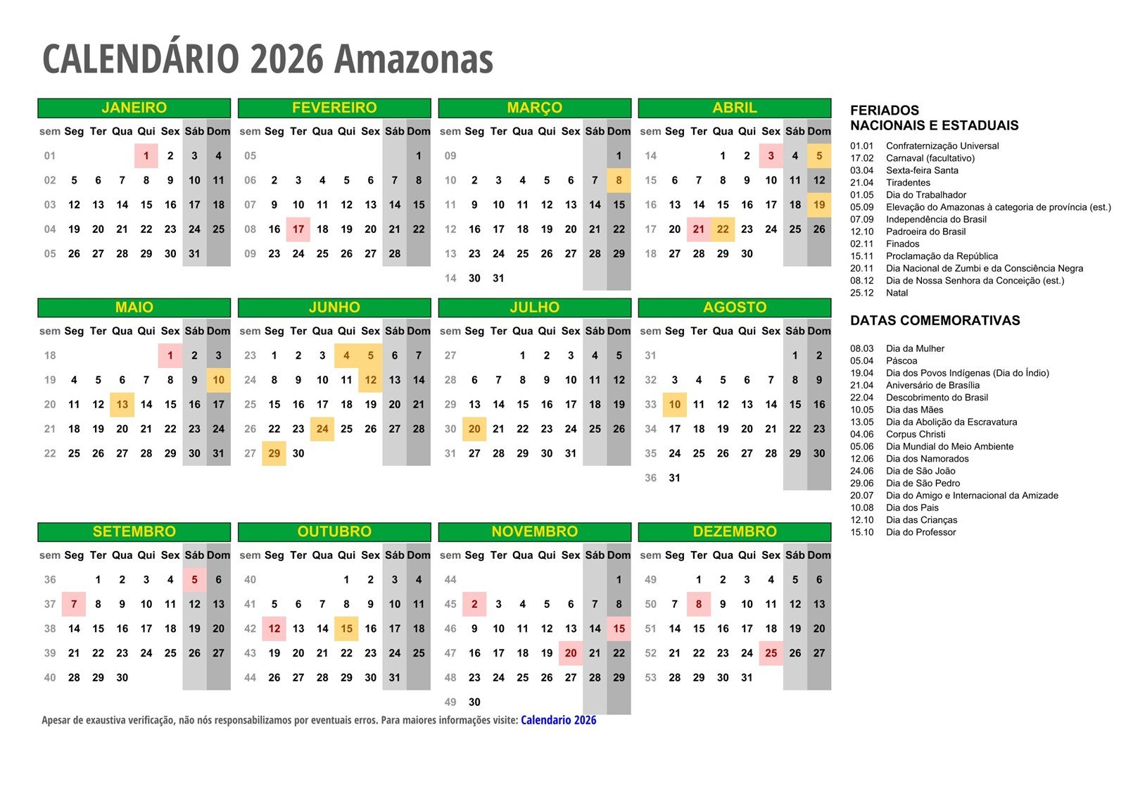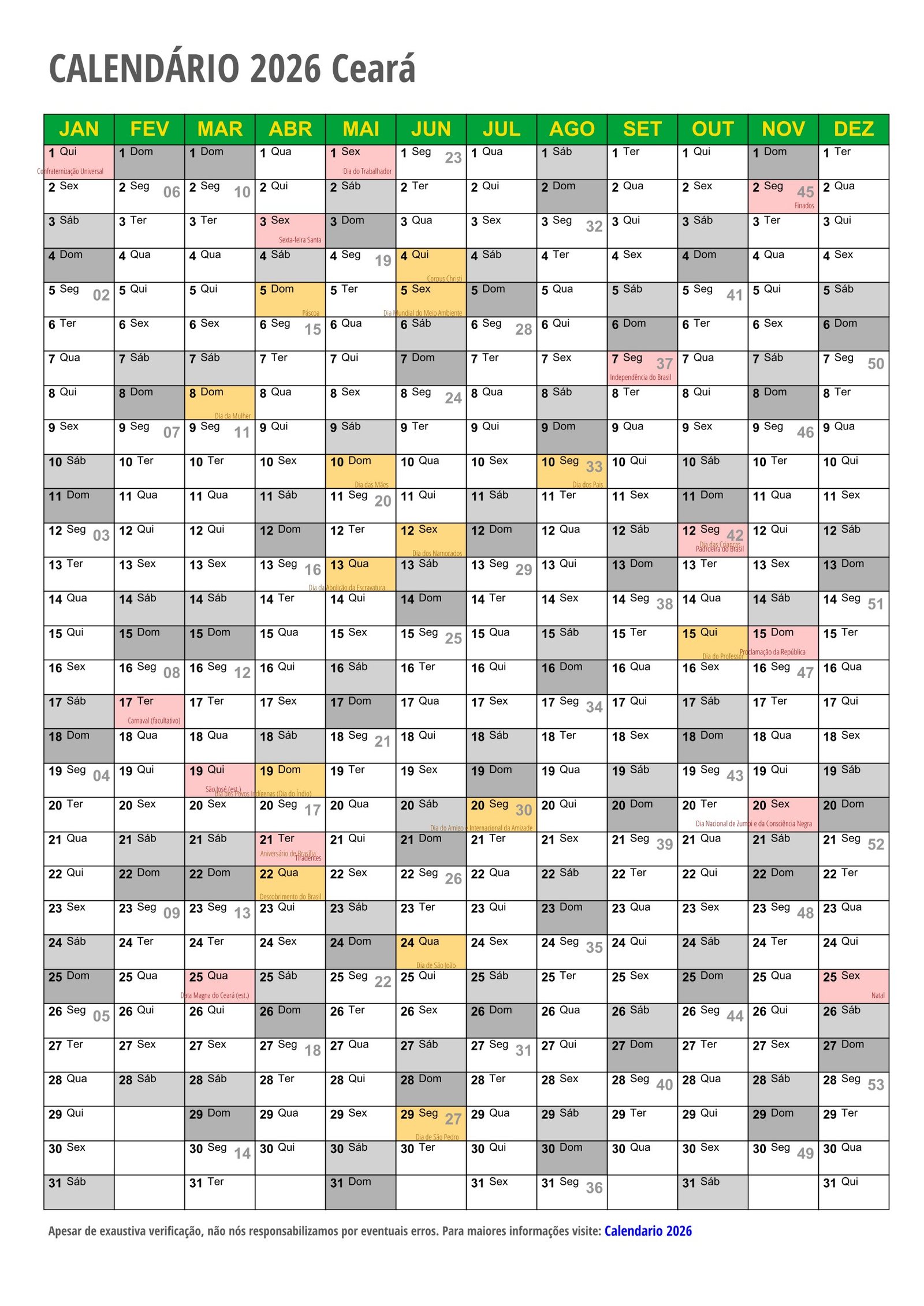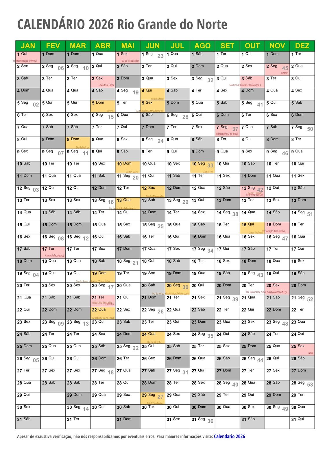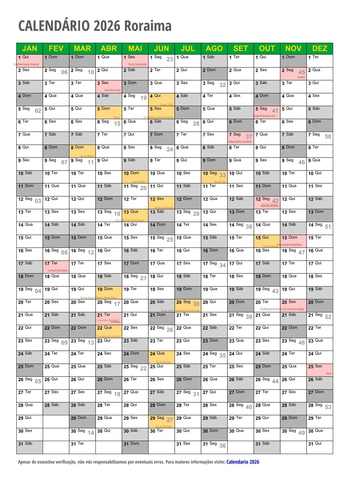 Calendário 2026 Mato Grosso do Sul para imprimir