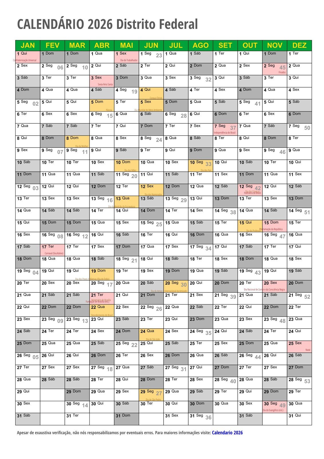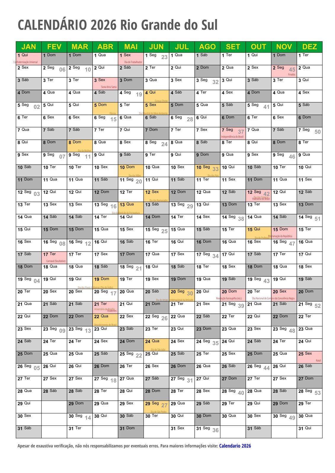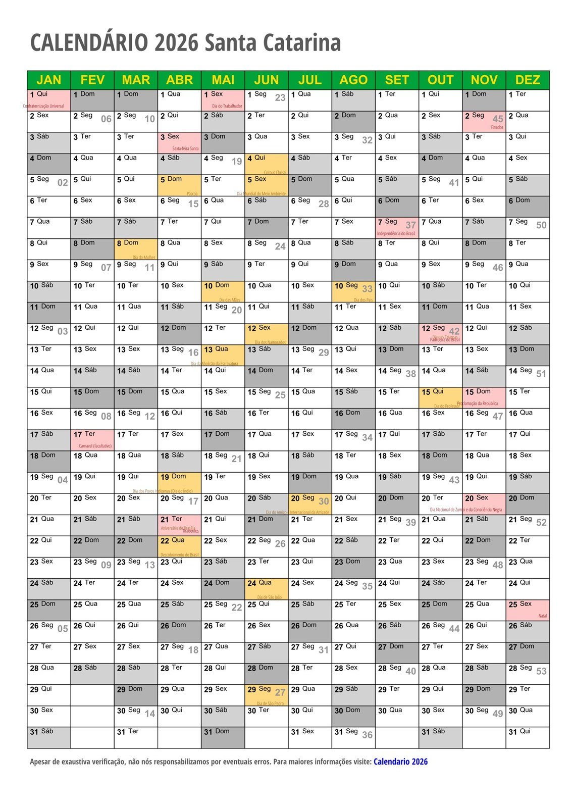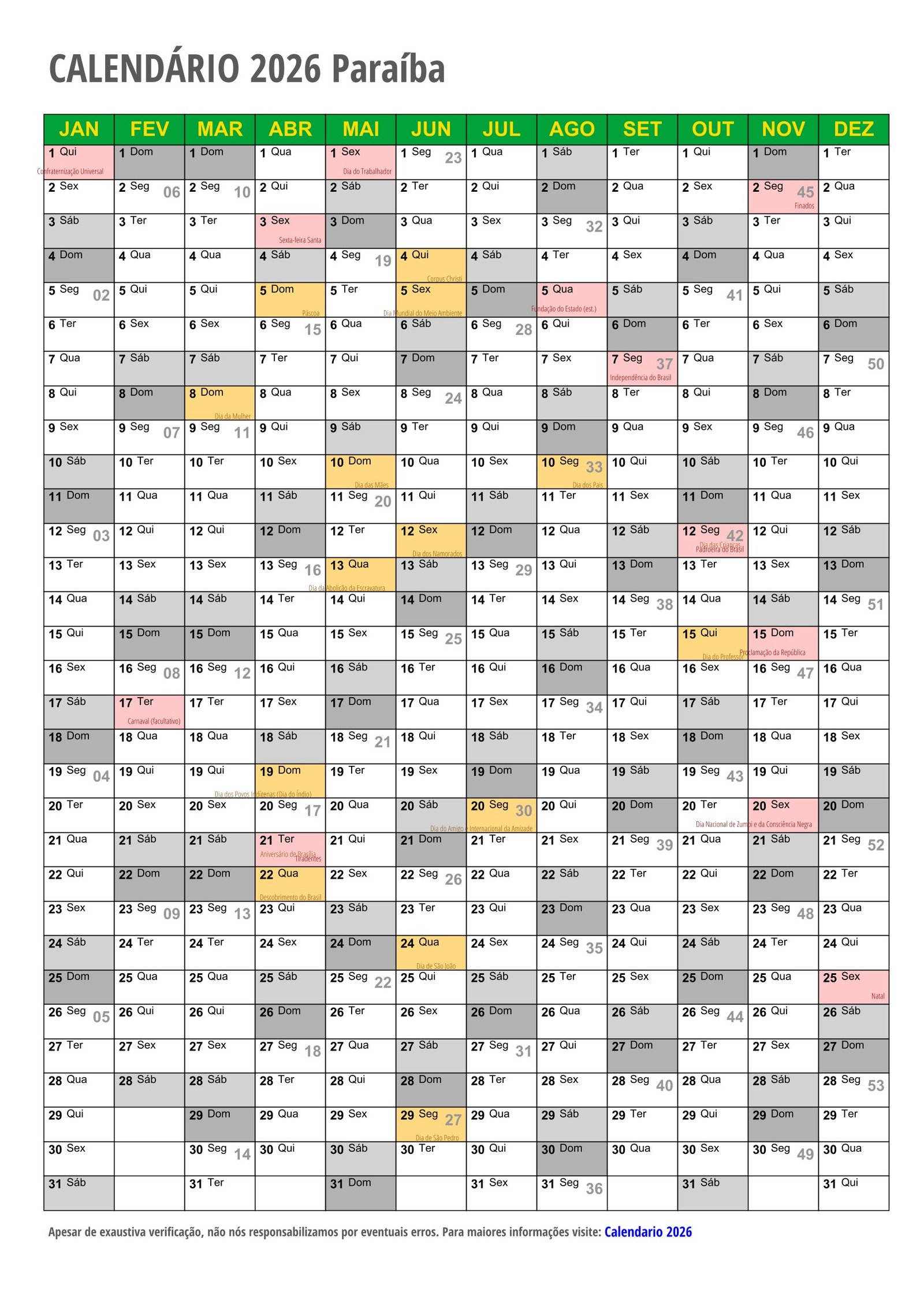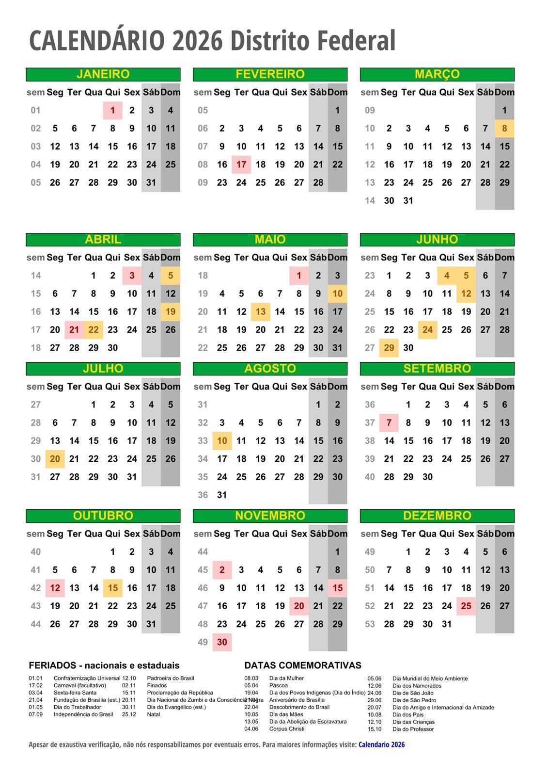 Calendário 2026 Mato Grosso do Sul para imprimir