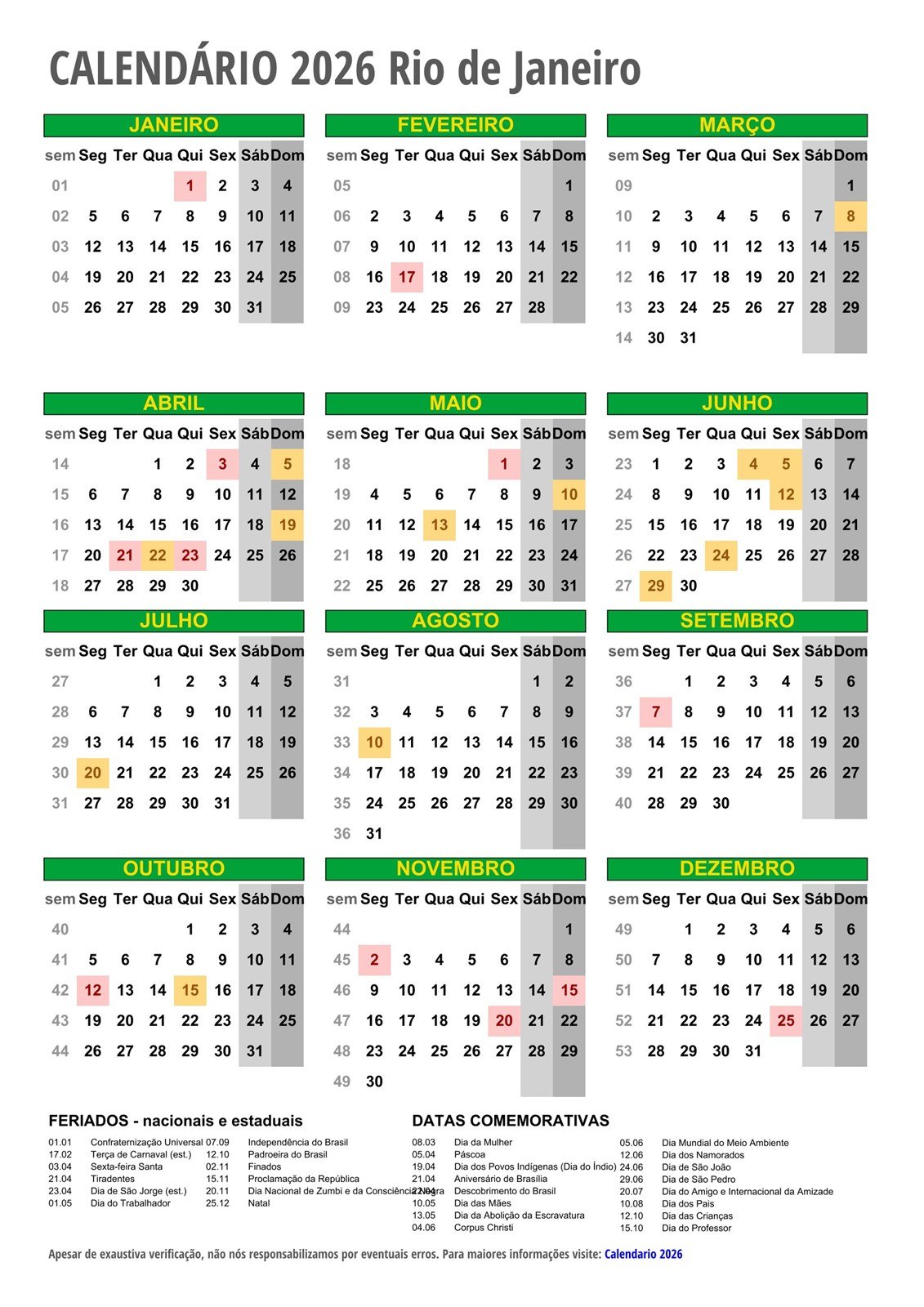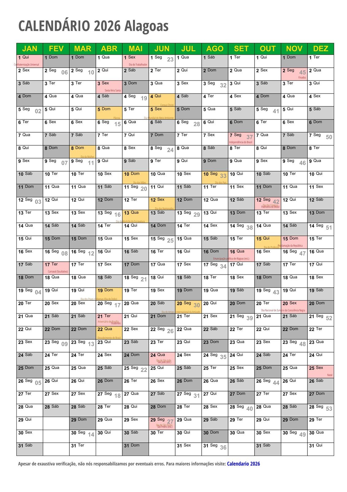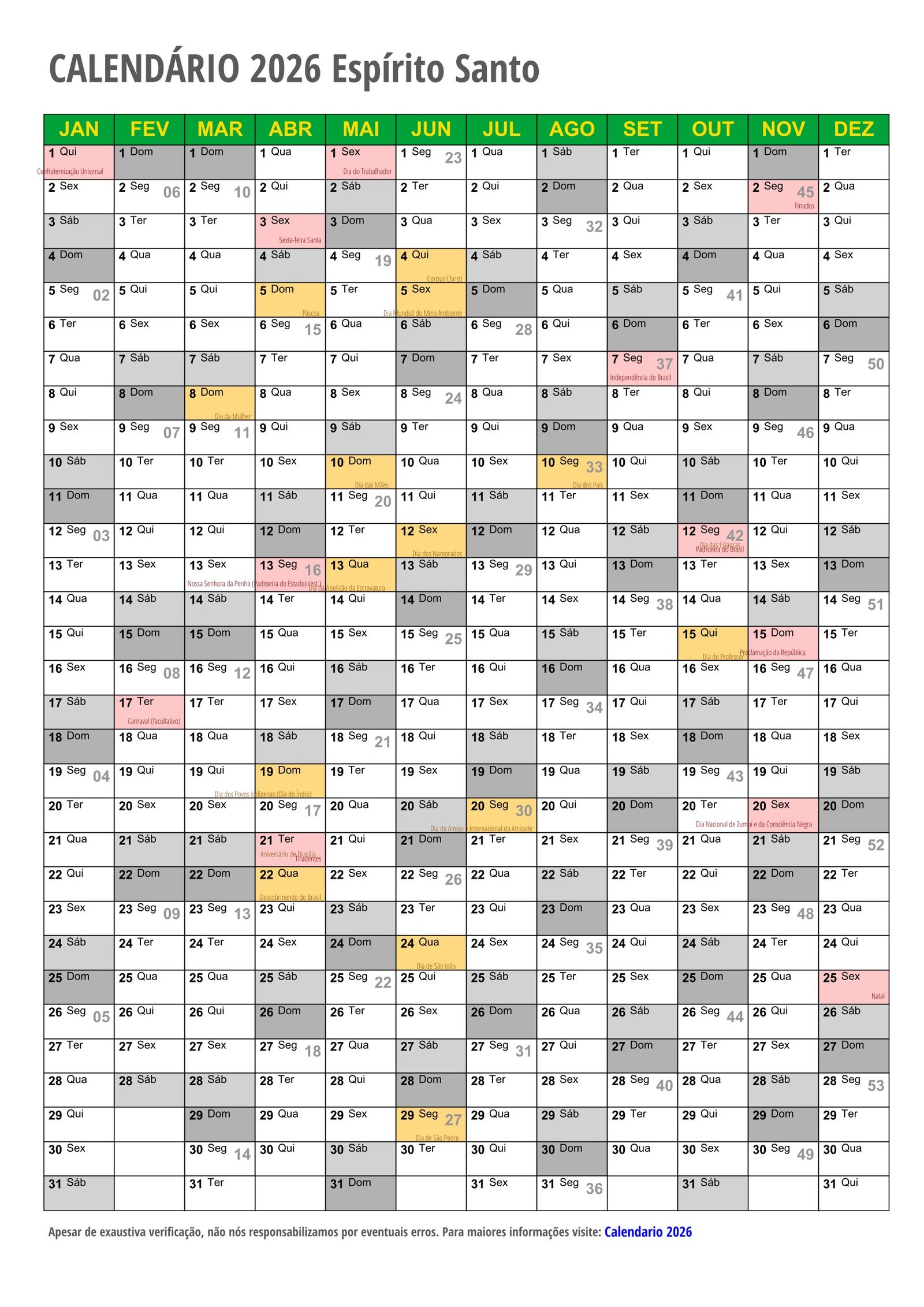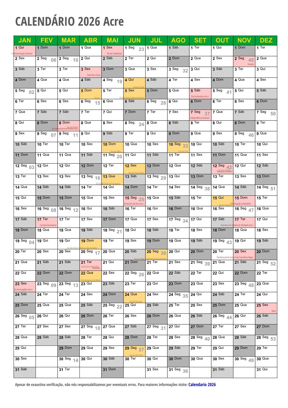 Calendário 2026 Mato Grosso do Sul para imprimir