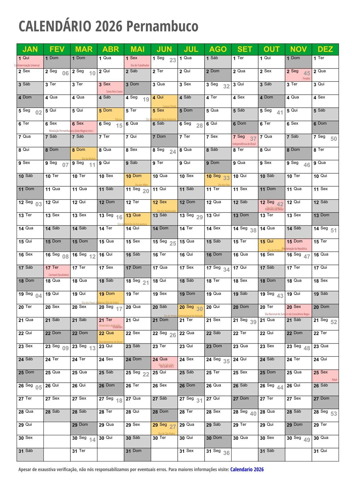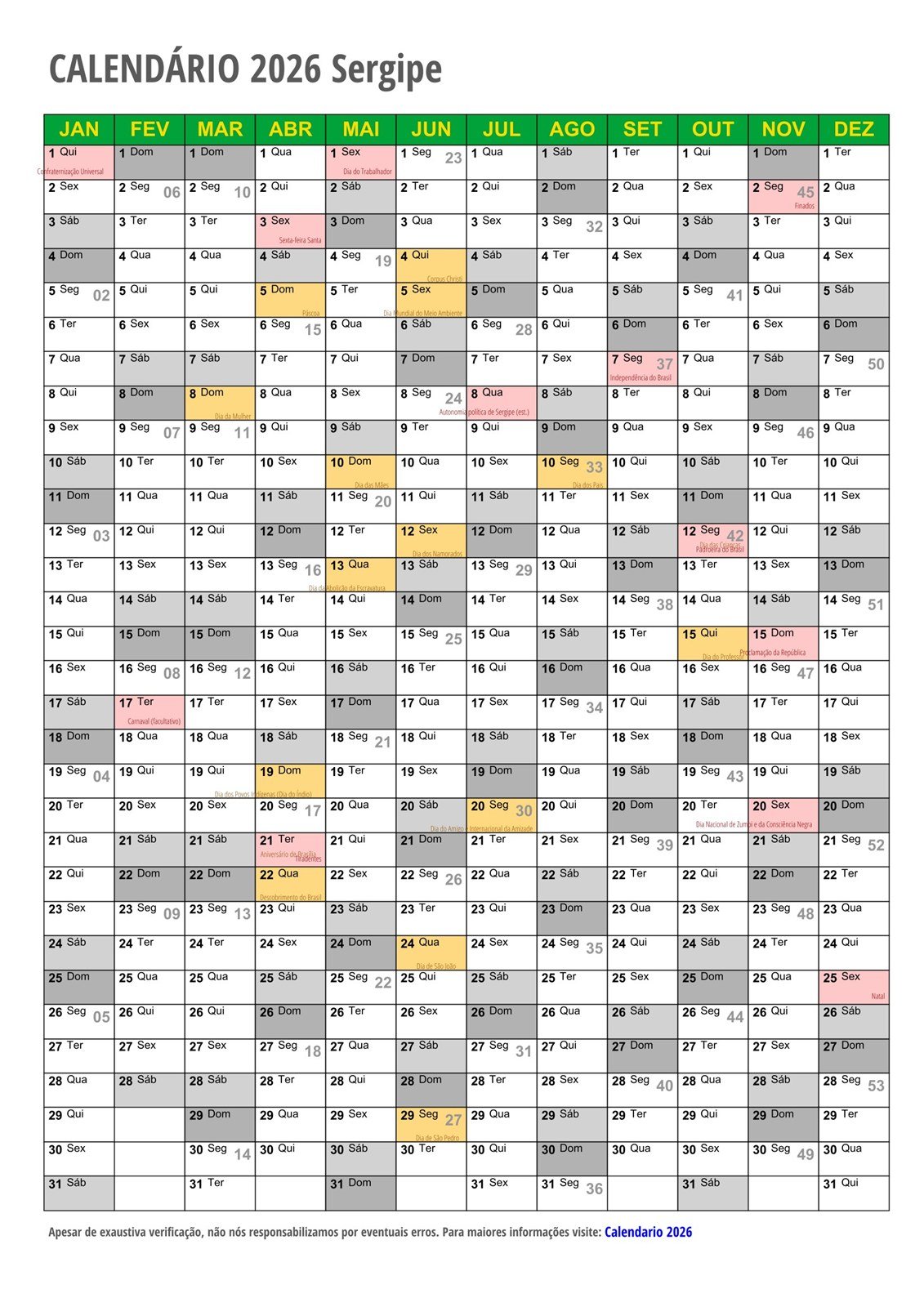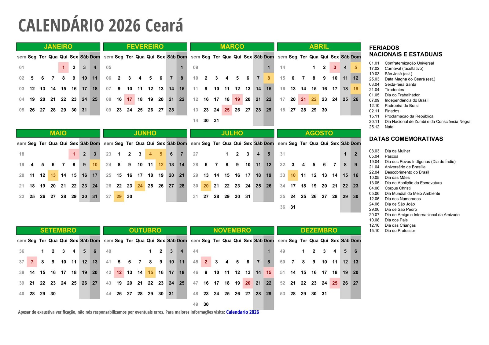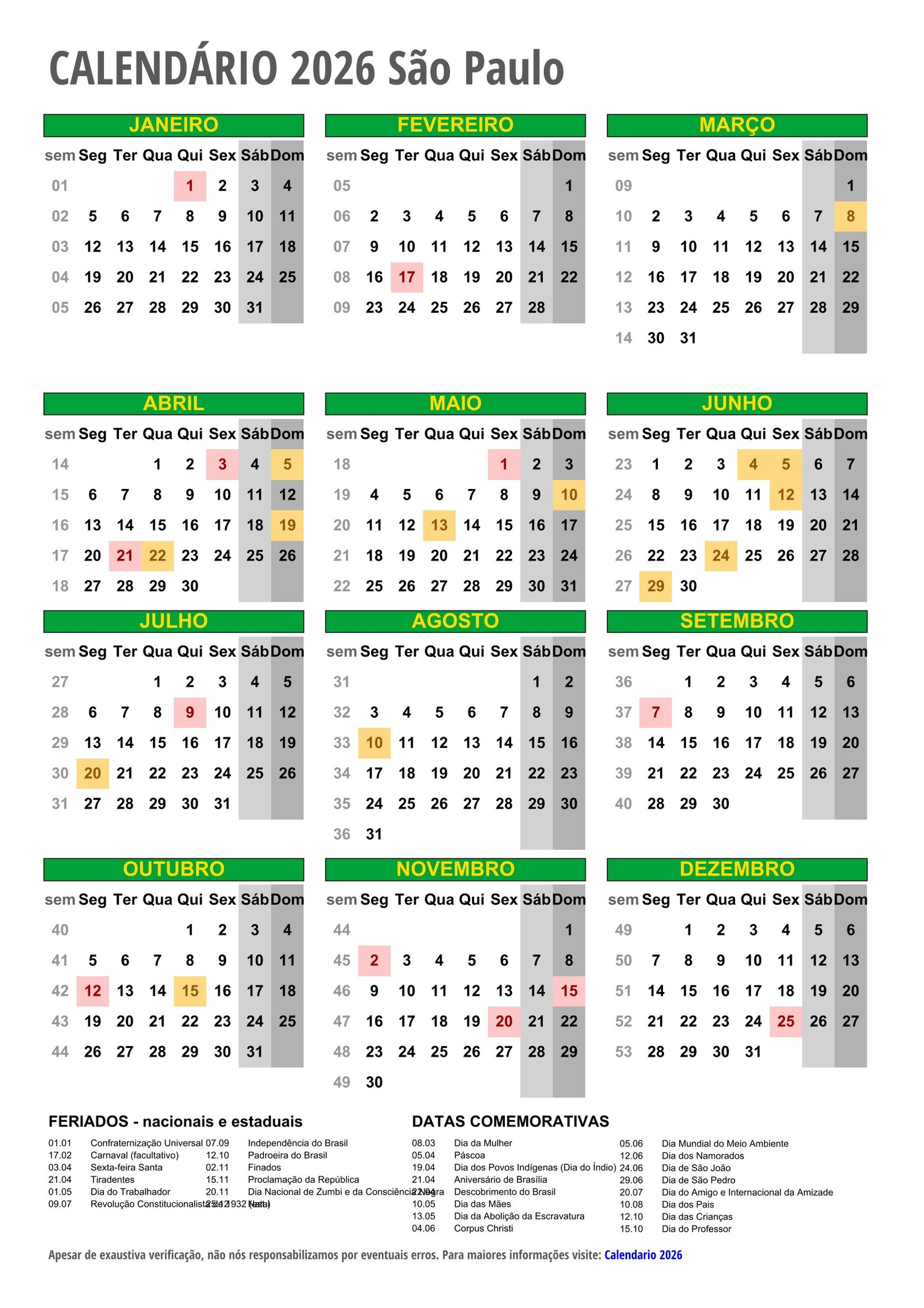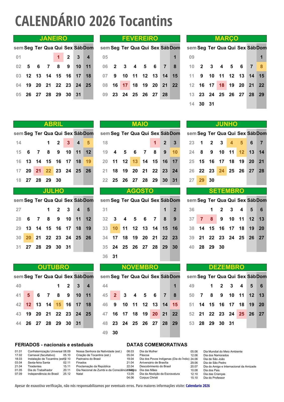 Calendário 2026 Mato Grosso do Sul para imprimir
