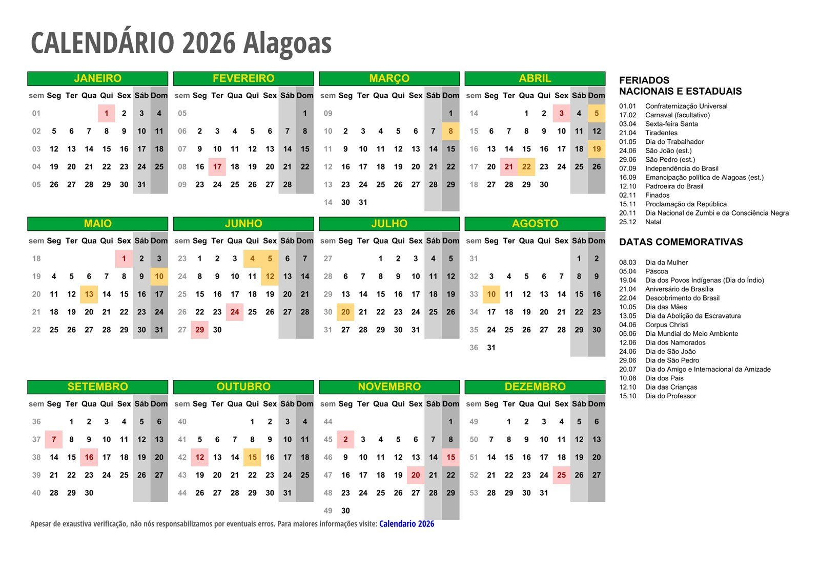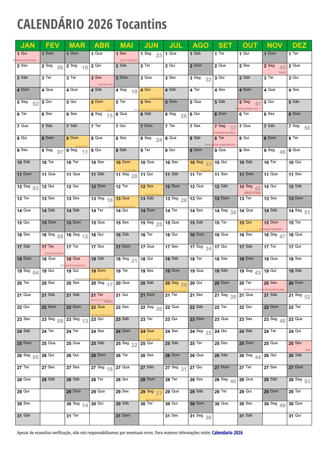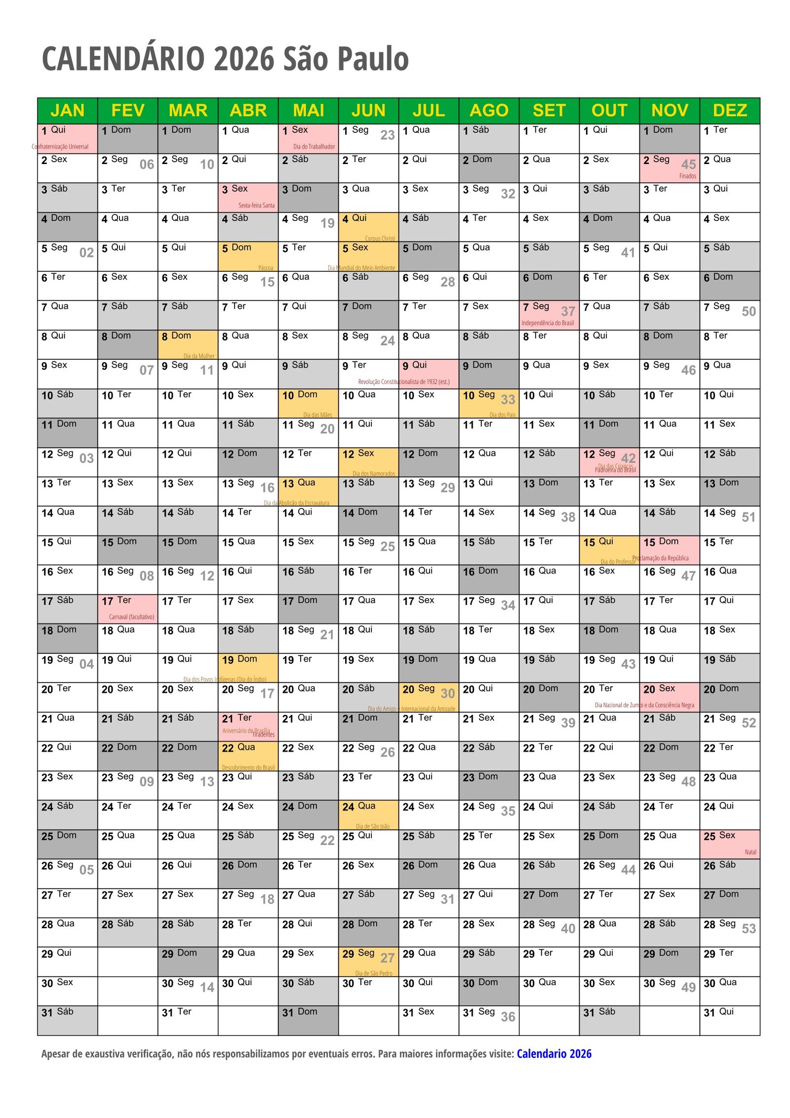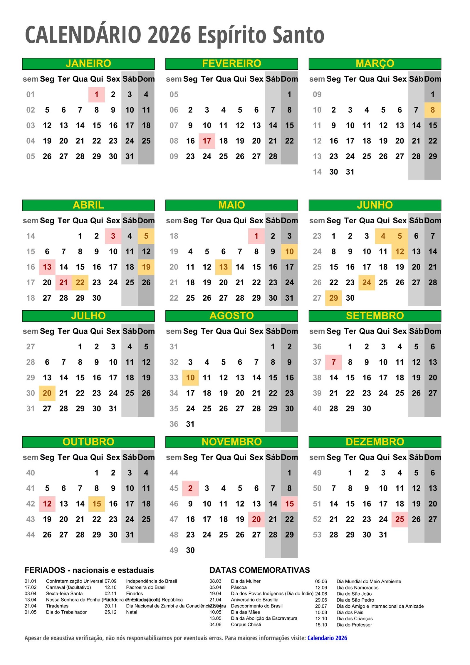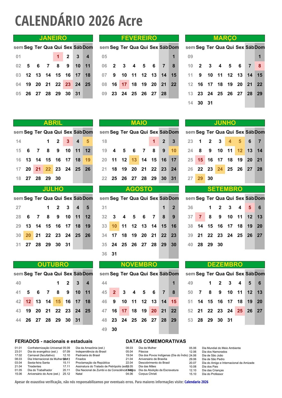 Calendário 2026 Mato Grosso do Sul para imprimir